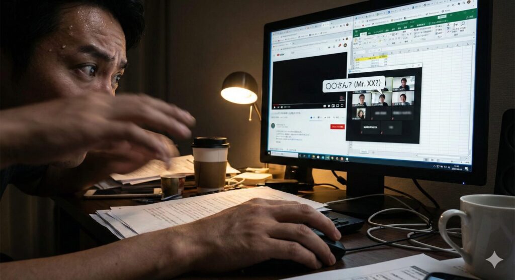 マウスカーソルを見失い、焦ってウィンドウを切り替え、ミュート解除ボタンを探す……この間の「空白の数秒間」。これが命取りになる。 その沈黙は、君が話を聞いていなかったことの「状況証拠」となるからだ。