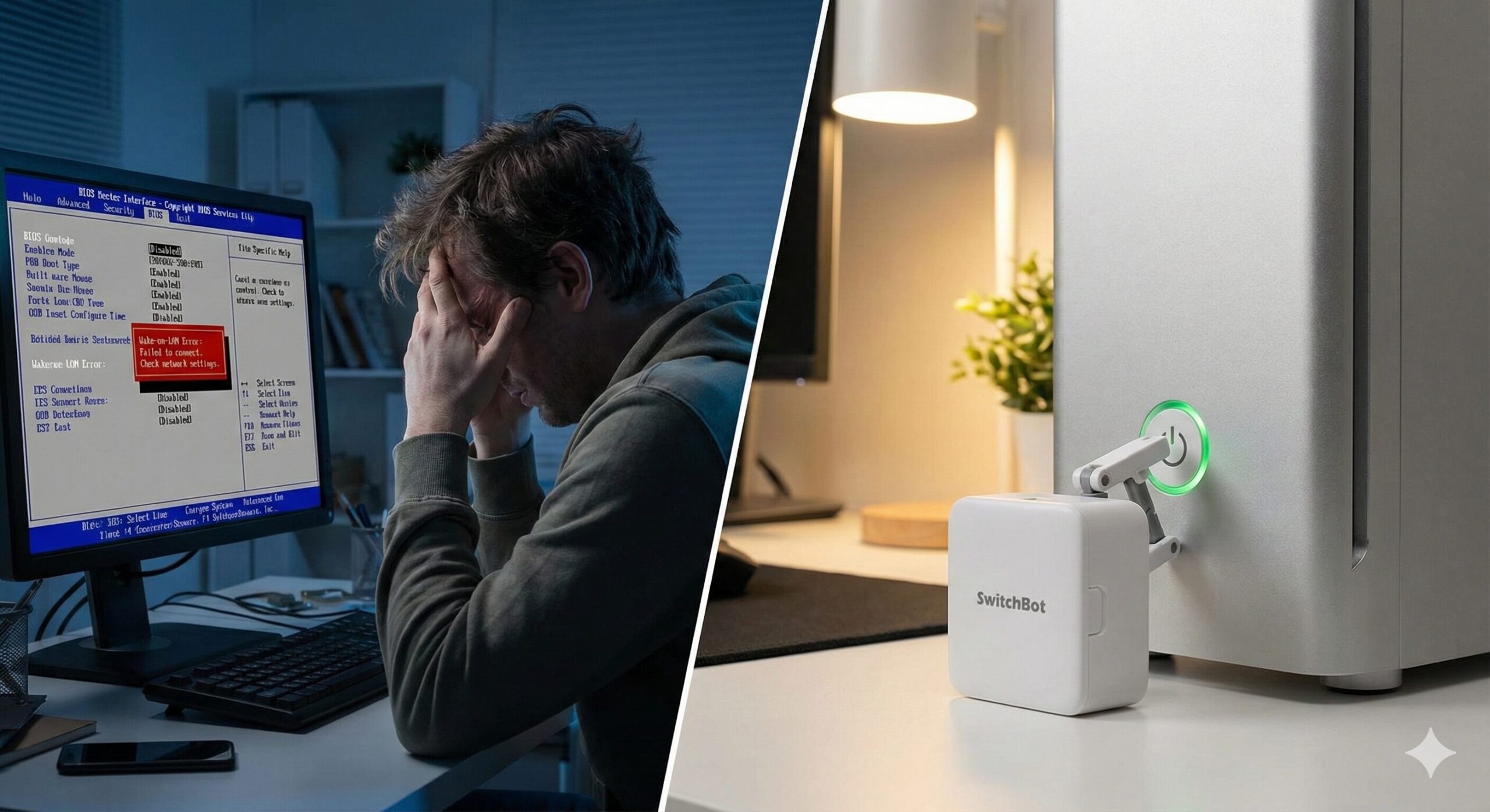 「物理的にボタンを押すロボット」を導入し、外出先からスマホひとつで自宅PCを強制起動させている。