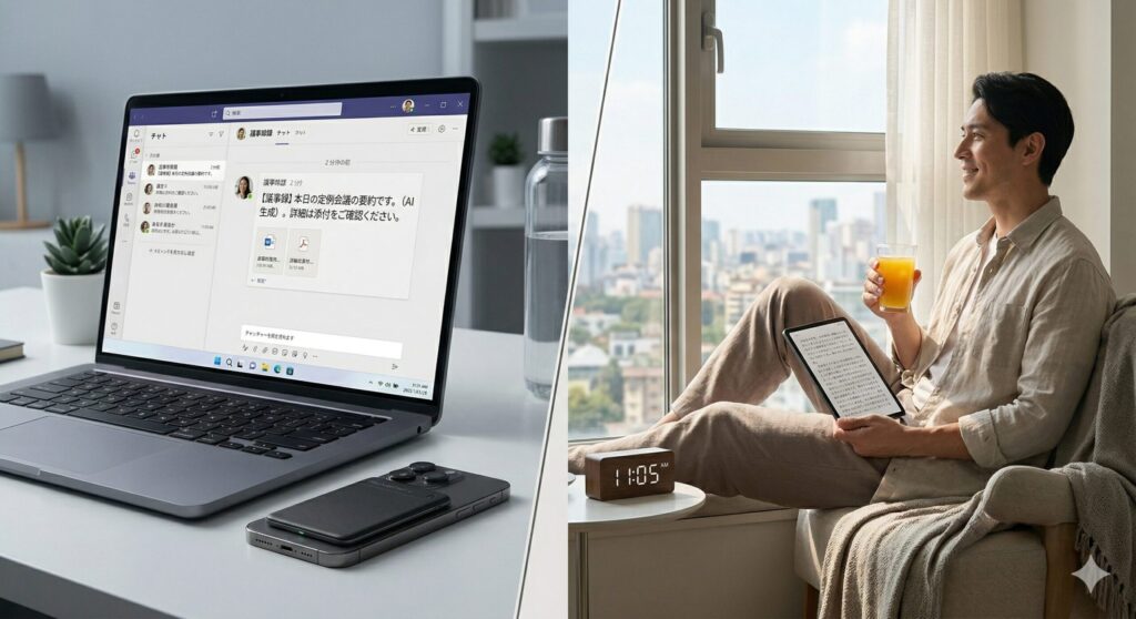 会議の音声はAIが完璧に記録・解析しているため、あなた自身はデュアルモニターの片隅で別の仕事を進めるなり、趣味に没頭するなり、完全に自由な時間を謳歌すればいい。これこそが真のオートパイロット化である。