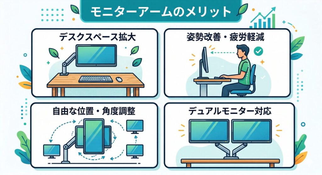 標準のスタンドからモニターアームに変更することで、得られる恩恵は非常に大きい。ここでは、導入によって得られる4つの代表的なモニターアームのメリットを解説する。
