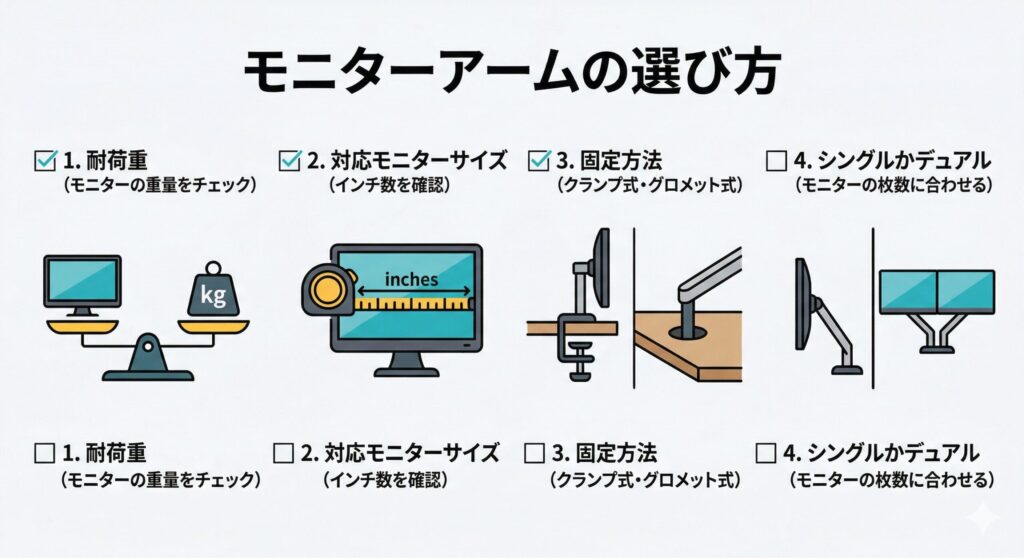 いざ購入しようと思っても、多くのメーカーから様々な種類が販売されているため迷ってしまうだろう。失敗しないためには、自身の環境に合わせてモニターアーム 比較を行い、以下の4つのポイントを押さえた選び方を実践することが重要である。