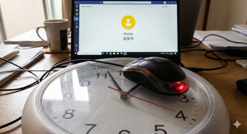 • 理由: 現代の光学式マウスやレーザーマウスのセンサーは高性能だ。秒針のような「細くて一定のリズムの動き」を、操作として認識しない(あるいは認識し続けることができない)ケースが多い。 トイレから戻ったら、マウスが時計からズレて落ちており、Teamsが黄色(退席中)になっていた――。この「意図しないログ切れ」こそが最大の事故要因だ。