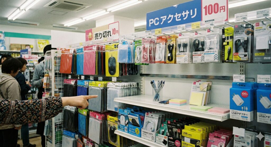 まず事実確認だ。 都内の大型店舗を含む複数の100円ショップ(ダイソー、セリア、キャンドゥ)の「電気小物」「PC用品」コーナーを実地調査した。